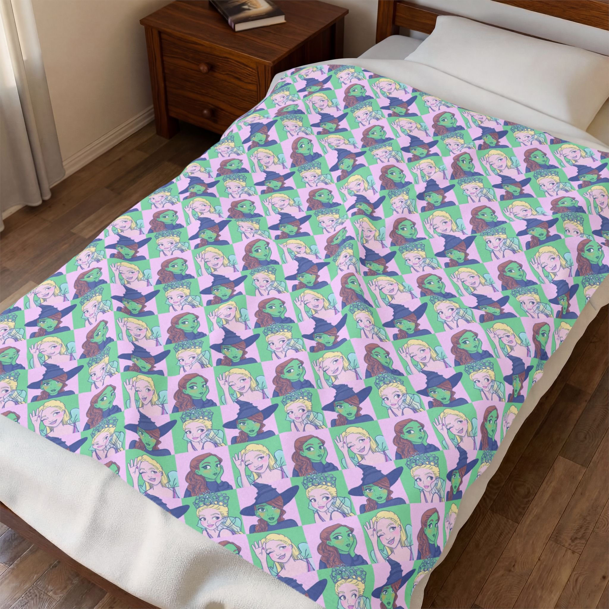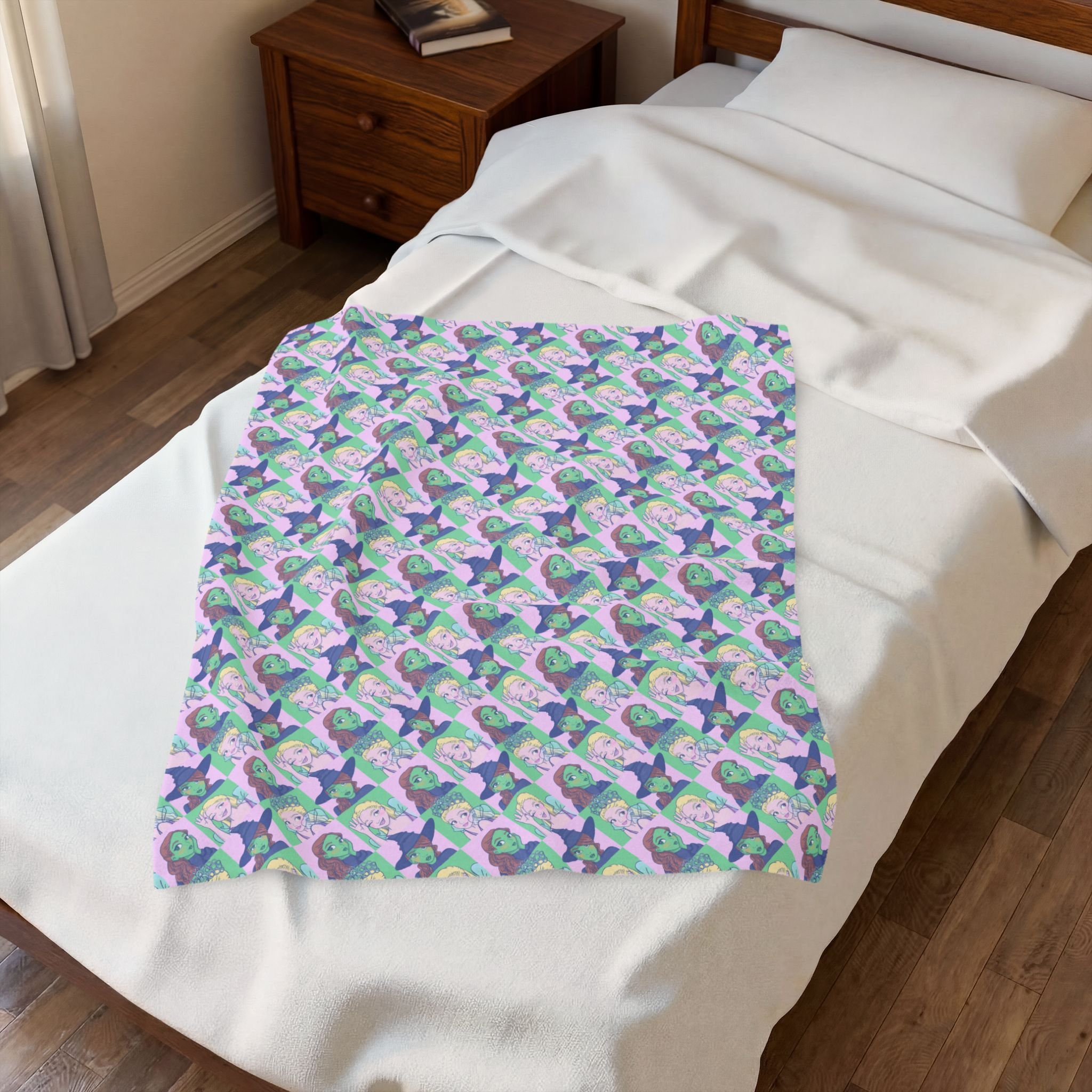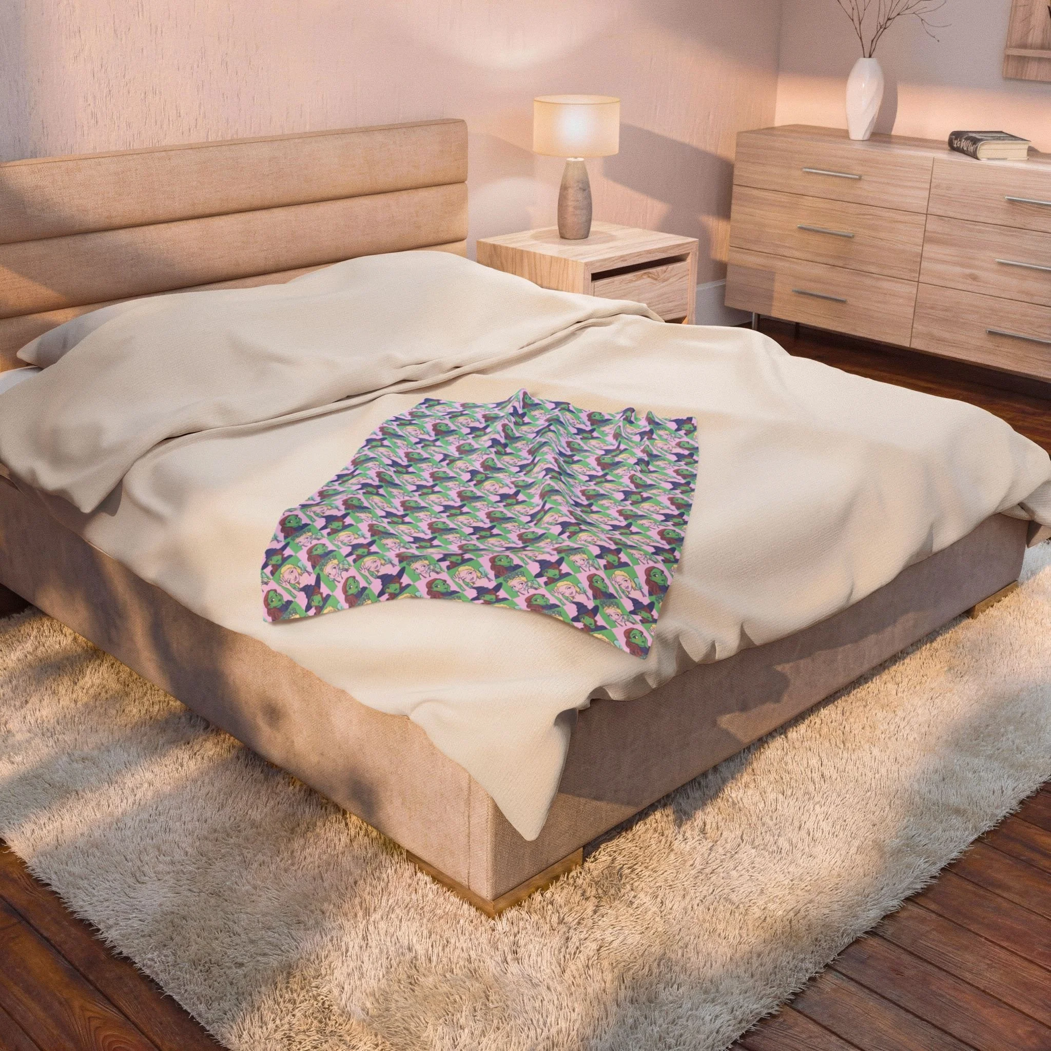 This velveteen plush blanket wraps you in soft, colorful comfort. The surface shows a crisp, vibrant print on one side that keeps its detail and color through everyday use. Medium-heavy weight and a silky touch make it great for curling up on the couch, layering at bedtime, or bringing along to outdoor movie nights. The reversible white backing keeps the look versatile while the reinforced double-needle topstitching holds up to frequent use. Thoughtfully finished and safety-tested, it brings a cozy, playful pop of pattern to a chill evening or a relaxed gathering with friends.